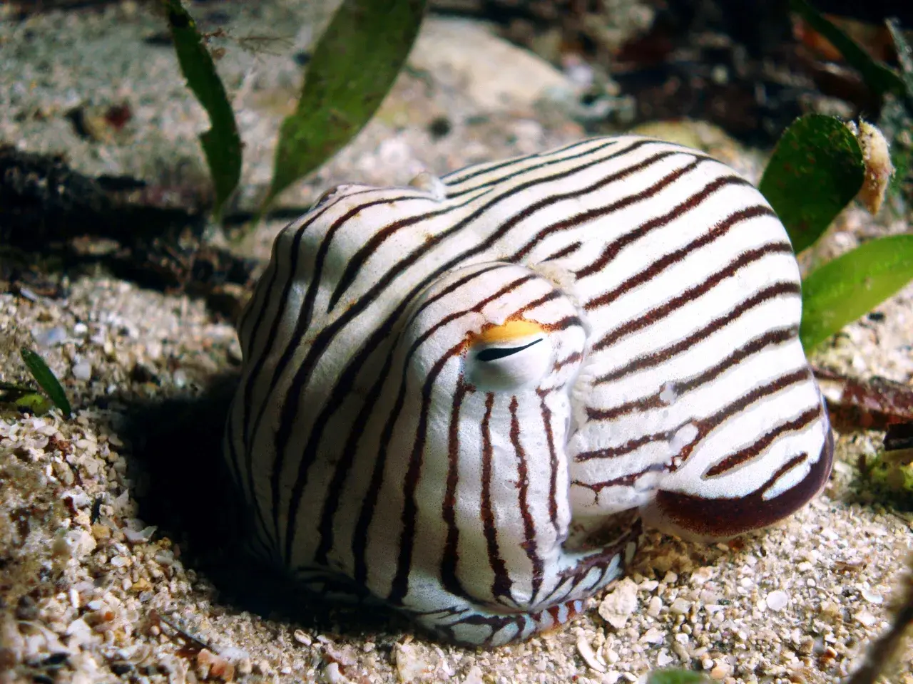 กลางวันของมันไม่ได้เริ่มด้วยการว่ายน้ำโชว์ลายสวยบนพื้นทะเล สิ่งที่เกิดขึ้นจริงคือ Striped Pyjama Squid ใช้หนวดตักทรายมากลบตัวเอง เหลือเพียงดวงตาเล็ก ๆ โผล่ขึ้นมารอดูความเคลื่อนไหวรอบตัว ใครมองผ่านเร็ว ๆ อาจเห็นแค่พื้นทรายธรรมดา แต่ตรงนั้นอาจมีนักล่าตัวจิ๋วซ่อนอยู่เงียบ ๆ