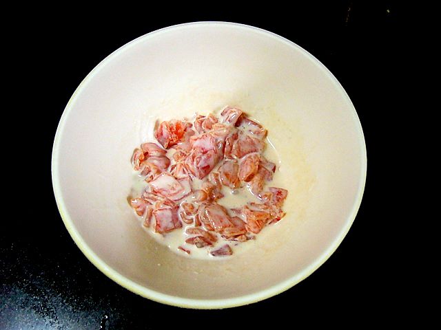 ตักครีมใส่ในปลาที่หั่นไว้ 3 ช้อน คลุกให้เข้ากัน ทิ้งไว้ 30 นาที