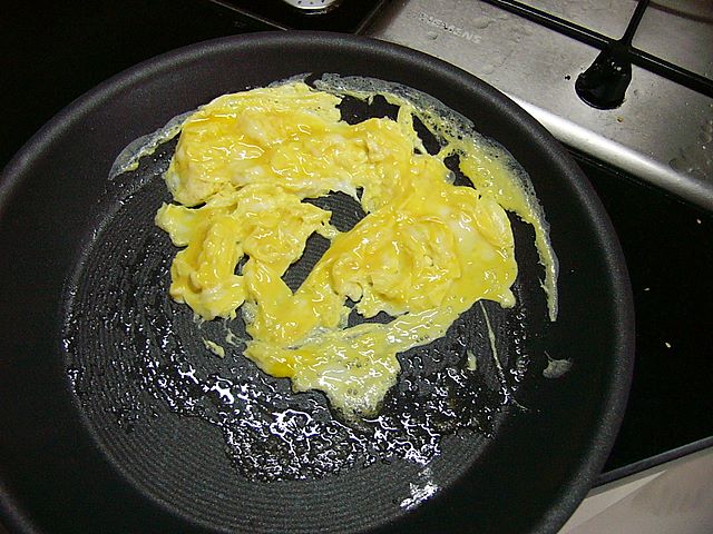 เทไข่ใส่ในกระทะ ใช้ตะหลิวคนไข่