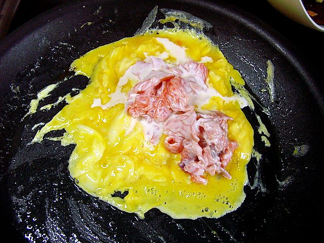 พอไข่สุกประมาณ 50% ให้เทแซลมอนรมควันที่คลุกครีมลงไป