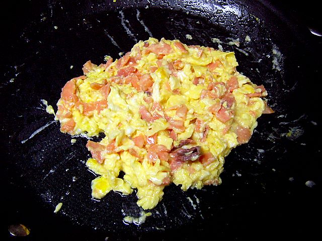 ใช้ตะหลิวคลุก และ คนให้เข้ากัน ยกกระทะออกจากเตาเมื่อไข่ใกล้สุก เพราะทิ้งไว้อีกเดี๋ยวเดียวไข่ก็จะสุกพอดี เนื้อไข่จะนิ่ม ไม่แข็งกระด้าง