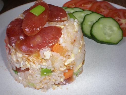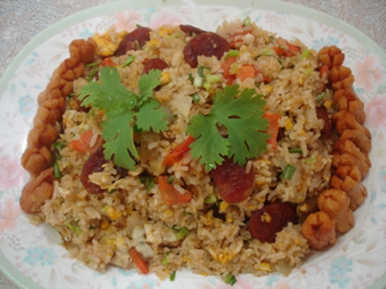 2. ตั้งกระทะน้ำมัน 2 ช้อนโต๊ะ ด้วยไฟกลางจนร้อน ใส่กระเทียมลงไปเจียวพอเหลือง ใส่กุ้งแห้งลงไปผัดพอหอมใส่ใส่กุนเชียงลงไปผัดพอกุนเชียงสุก ใส่หอมหัวใหญ่ลงไปผัดเข้าด้วยกัน จากนั้นเกลี่ยเครื่องทั้งหมดไว้ข้างกะรทะ ใส่น้ำมันที่เหลือลงไปตอกไข่ใส่ลงไปคนเร็วๆอย่าให้ไข่สุกมากจากนั้นใส่ข้าวลงไปผัดคลุกเคล้าส่วนผสมทุกอย่างให้เข้ากันใส่ซอสปรุงรสและซีอิ้วขาวลงไปผัดจนเข้ากันดีใส่ต้นหอมซอยลงไปปิดไฟคนให้เข้ากันอีกครั้ง