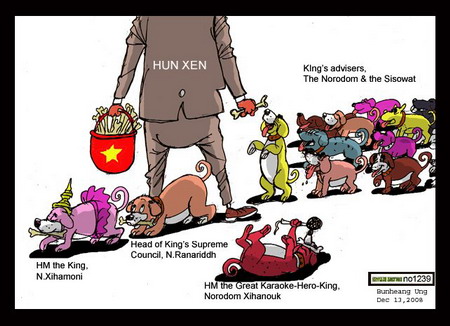 ภาพ นี้ล้อว่าทุกๆตำแหน่งในราชสำนักที่ใกล้ชิดกับพระเจ้าแผ่นดินต่างเป็นสุนัข รับใช้ ที่คอยกินค่าจ้างจาก ฮุน เซน ทั้งสิ้น ไม่ว่าจะเป็น ที่ปรึกษากษัตริย์ / หัวหน้าเจ้าที่ประจำวัง / คณะมนตรีสูงสุดของกษัตริย์ ที่ต่างเหมือนหู ตา ของ ฮุน เซน และคอยส่งเอกสารต่างๆขึ้นไปให้พระมหากษัตริย์ทรงลงพระนามรับรอง