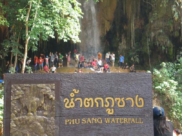 ตั้งอยู่ในเขต อุทยานแห่งชาติภูซาง เป็นน้ำตกที่มีน้ำอุ่นเพียงแห่งเดียวที่พบในประเทศไทย อุณหภูมิสูงถึง 35 -36oC น้ำตกตั้งอยู่บนเทือกเขาดอยผาหม่น เกิดจากสายน้ำอุ่นและปราศจากกลิ่นกำมะถันที่ไหลมาจากผาหินปูนสูง 25 เมตร ใต้น้ำตกเป็นแอ่งน้ำสีเขียวมรกตที่ใสราวกับกระจก จึงเหมาะสำหรับการลงแช่น้ำให้อบอุ่น สบายตัว เหนือน้ำตกภูซางมีเส้นทางชมป่าต้นน้ำซึ่งเป็นป่าดงดิบ อยู่ห่างจากที่ทำการอุทยานแห่งชาติ 1 กิโลเมตร กิจกรรม - เดินป่าศึกษาธรรมชาติ - เที่ยวน้ำตก