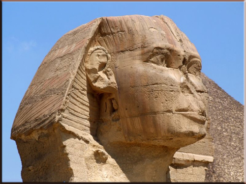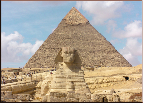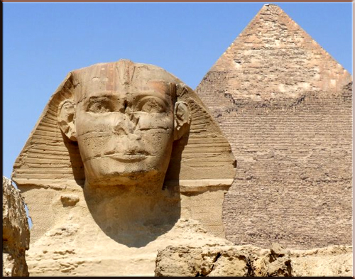 “สฟิงซ์ Sphinx” ซึ่งแกะสลักจากเนินหินธรรมชาติ มีส่วนหัวเป็นรูปพระพักตร์ของฟาโรห์และมีลำตัวเป็นสิงโต