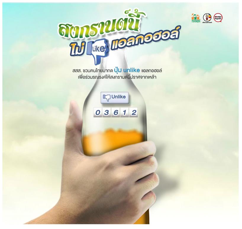 สงกรานต์ปี ๒๕๕๕ นี้ สสส. อยากให้คนไทยเดินทางกลับบ้านอย่างปลอดภัย จึงได้จัดกิจกรรมร่วมรณรงค์ลดแอลกอฮอล์อย่างง่ายๆ ผ่านโลกออนไลน์ เพียงเข้ามากดปุ่ม “unlike” แอลกอฮอล์ในหน้า Fanpage ของ สสส. เพื่อร่วมกันปลุกจิตสำนึกให้คนไทยรู้ว่า สงกรานต์นี้จะมีแต่เรื่องดีๆ ได้ ถ้าทุกคนสนุกสนานโดยปราศจากเครื่องดื่มแอลกอฮอล์