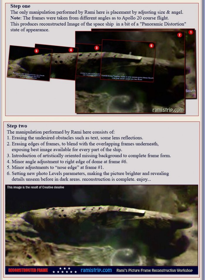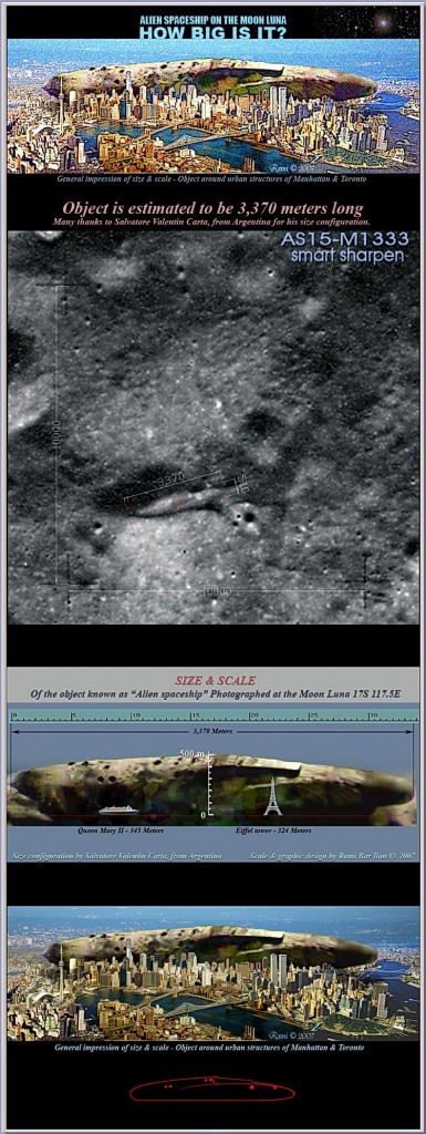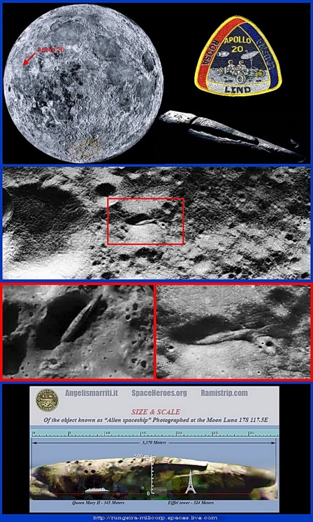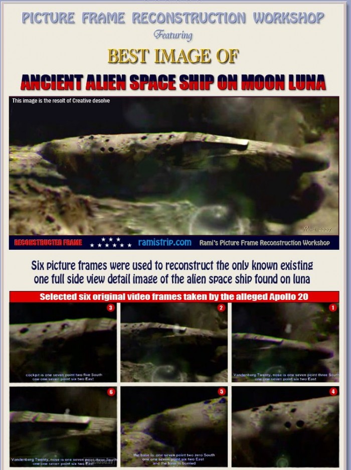 ข่าวสำคัญที่อยากจะบอก เกี่ยวกับยานลำนี้ ซึ่งอยู่บนดวงจันทร์มาแล้วหลายปี ตัวยานมีความยาวสองไมล์ ความสูงมากกว่าหอไอเฟล (Eiffel Tower) ข้างในมีโหลแก้วบรรจุตัวอ่อนมนุษย์ต่างดาว ขนาด 10 เซนติเมตร จำนวนมาก แต่ถูกทำลายไปไม่เป็นตัว ที่ชัดเจน คือ ตัวยานเก่ามากแล้ว มีอักขระบนกระดาษ เป็นอักษรหางยาว ๆ มีศพผู้หญิงคล้ายคนจีน ที่สวยจนเรียกว่า “โมนาลิซ่า” (Mona Lisa) ไม่เน่าเบื่อย เมื่อนำศพกลับขึ้นยานลูก ก็เอาแท่งที่ตรึงหน้าศพออก และนี่เป็นภารกิจร่วมของนักบินอวกาศอเมริกัน และ รัสเซีย เป็นภารกิจเพื่อการสำรวจในยานนี้โดยเฉพาะ ป่านนี้คงวิเคราะห์ ดีเอ็นเอ – DNA หญิงคนนี้ได้แล้ว