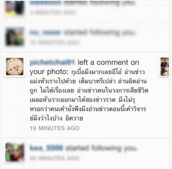 "กูเบื่อ...มากเลยอีโอ๋ อ่านข่าวแม่งหัวเราะไปด้วย เต็มบาทรึเปล่า อ่านผิดอ่านถูก ไม่ได้เรื่องเลย อ่านข่าวคนในวงการเสียชีวิตเผลอหัวเราะออกมาได้สองข่าวรวด ...ไม่รู้หรอกว่าคนเค้านั่งฟัง...อ่านข่าวตอนนี้เค้าวิจารย์...ว่าไงบ้าง อิค_ าย"