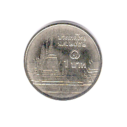 ๖.เหรียญ ๑ บาท เป็นเหรียญกษาปณ์โลหะสีขาว (ไส้เหล็กชุบนิกเกิล) ด้านหน้าเป็นพระบรมรูปพระบาทสมเด็จพระเจ้าอยู่หัว และด้านหลังเป็นรูปพระศรีรัตนเจดีน์ วัดพระศรีรัตนศาสดาราม ในพระบรมมหาราชวัง กรุงเทพมหานคร