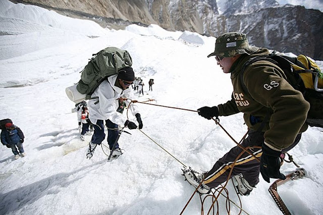 ธารน้ำแข็งเซียเชน อยู่บนพื้นที่แคชเมียร์ เขตแบ่งแยกการควบคุมของอินเดียกับปากีสถาน อยู่สูงเหนือระดับน้ำทะเลเฉลี่ยกว่า 6,300 เมตร (บางแหล่งข้อมูล 6,700เมตร )ครอบคลุมพื้นที่แนวยาว 77 กม. ถูกกำหนดเป็น “เส้นควบคุม” คล้ายเขตปลอดทหาร