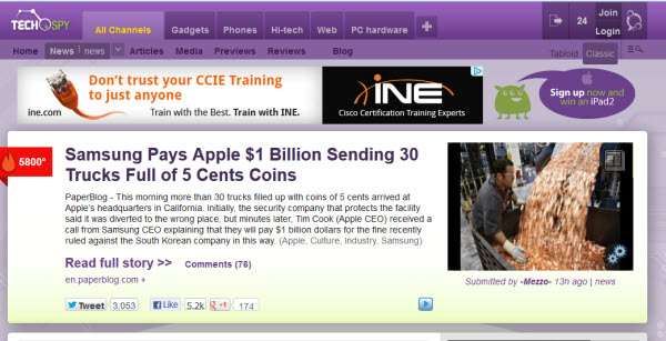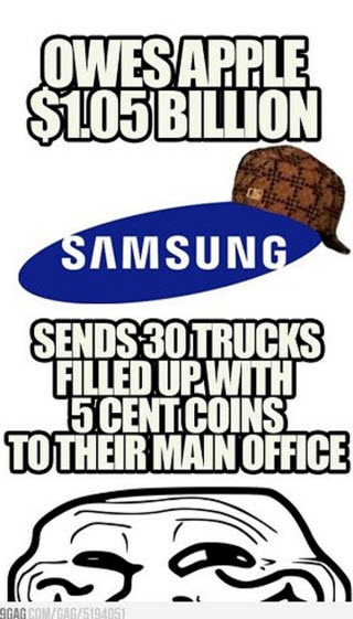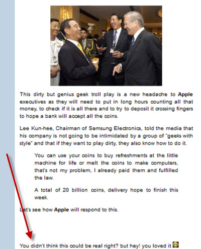 โดยอ้างว่าเป็นข่าวที่ซัมซุงได้ขนเงินไปจ่ายค่าปรับแอปเปิลด้วยเหรียญ 5 เซนต์ เป็นจำนวน 30 คันรถบรรทุกที่บริษัทของแอปเปิล