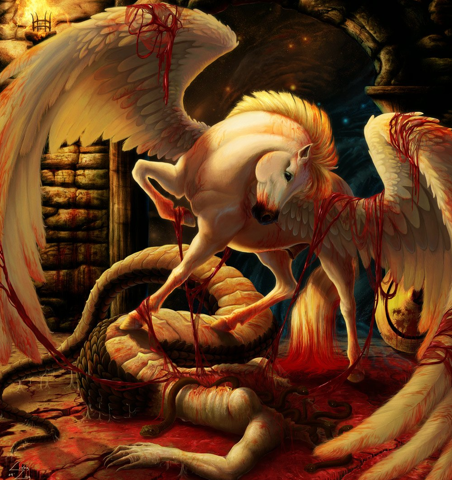 ประวัติของเพกาซัสตัวนี้ค่อนข้างจะน่าขนลุกอยู่สักหน่อย เรื่องเริ่มมาจากนางกอร์กอน เมดูซ่า นางคนนี้มีความร้ายกาจมากแต่ก็ถูกวีรบุรุษ เปอร์ซีอุล ฟันคอขาดตาย ในขณะที่ นางสิ้นใจตายนั้น มีร่างของม้ากำยำพ่วงพี พร้อมด้วยปีกอันกว้างสง่างาม กระโจนออกมา จากลำคอของนาง ม้าตัวนั้นก็คือ เพกาซัส นั่นเอง เมื่อออกมาแล้วมันก็แผลงฤทธิ์ จนไม่มีใครสามารถปราบได้เลยซักคน ทั้งที่เพกาซัสเป็นความหวัง ของคนทั้งเมือง นอกจากความเก่งกล้าในฝีตีนและฝีปีกแล้ว เพกาซัสยังมีควาสมารถอีกอย่าง คือตอนที่มันเกิดมาใหม่ๆ และออกวิ่งอย่างคึกคนอง นั้น น้ำที่กระเซ็นจากรอยเท้า ที่มันวิ่ง ก่อให้เกิดน้ำพุสวยงาม ที่กวีและศิลปินชื่นชมกันนักหนา คือน้ำพุ ฮิปโปครีนี (Hippocrene) ที่เป็นที่รู้จักกันในวรรณคดกรีกโบราณ ว่ากันว่า ใครได้ดื่มน้ำพุนี้แล้ว โอกาสที่จะเป็นกวีเอกอยู่แค่เอื้อมที่เดียว เพกาซัสคึกอยู่ ได้ไม่นาน ก็มีคนดีมาปราบ เป็นเด็กหนุ่มรูปหล่อชาวเมืองโครินทร์มีนามว่า "เบลเลอโรฟอน (Bellerophon)