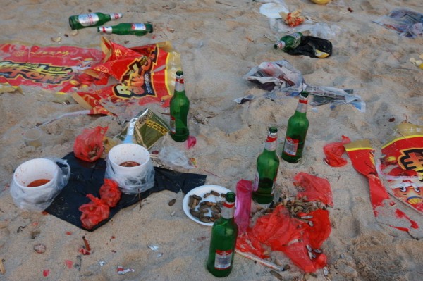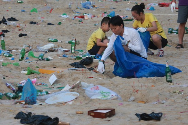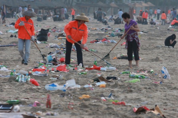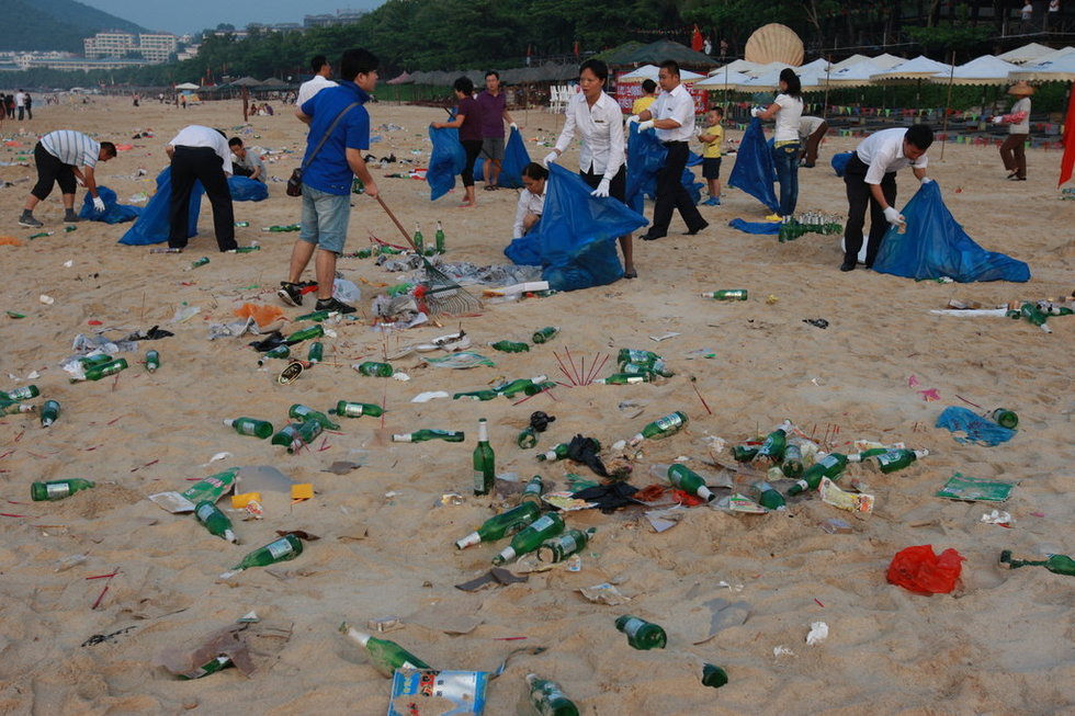 วันที่ 1 ตุลาคมที่ผ่านมา หลังจากเสร็จสิ้นเทศกาลวันหยุดยาวของคนจีน ชายหาดยาวกว่า 3 กิโมเมตรในจุดชมวิวดาดองไฮ ชายหาดซานย่า บนเกาะไหหลำ กลาดเกลี่อนไปด้วยขยะที่บรรดาคนในท้องถิ่นและนักท่องเที่ยวที่เฝ้าดูพระจันทร์เต็มดวงทิ้งไว้หนักกว่า 50 ตันทั่วบริเวณชายหาด แน่นอนย่อมส่งผลกระทบต่อมลพิษทางทะเล