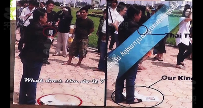 นอกจากนี้ในสังคมโซเชียลของกัมพูชายังปรากฏภาพผู้สื่อข่าวสาวไทย ซึ่งอ้างว่าเป็น น.ส.ฐปนีย์ เอียดศรีไชย ผู้สื่อข่าวทีวีช่อง 3 ของไทย แต่งชุดสีดำยืนรายงานข่าว โดยบริเวณเท้าของผู้สื่อข่าวคนดังกล่าวยืนเหยียบพระบรมฉายาลักษณ์สมเด็จพระ นโรดมสีหนุ อดีตกษัตริย์ของกัมพูชา ที่วางอยู่ที่พื้นใต้เท้าของผู้สื่อข่าวคนดังกล่าว และบรรยายเป็นภาษากัมพูชา ว่าพิธีกรไทยกำลังเอารูปสมเด็จตา(ชาวกัมพูชาเรียกสมเด็จพระนโรดมสีหนุว่า สมเด็จตา) วางไว้ใต้ฝ่าเท้า ท่ามกลางชาวกัมพูชาและสื่อมวลชนจากทั่วประเทศ