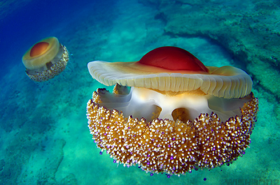 ส่วนแมงกะพรุน Cotylorhiza tuberculata เป็นแมงกะพรุนขนาดเล็ก อาจจะโตได้ 35 เซ็นติเมตร สิ่งที่ทำให้มันประหลาดกว่าแมงกะพรุนทั่วไปคือ พวกมันสามารถว่ายน้ำบังคับได้โดยตัวมันเอง ไม่ต้องอาศัยกระแสน้ำในการพัดพาไป พวกอาศัยอยู่ในน้ำอุ่น