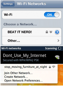 เดี๋ยวนี้ที่เมืองนอก มีหลายๆคนเริ่มตั้งชื่อเครือข่าย Wi-Fi เพื่อแสดงออกถึงตัวตนของคนๆนั้นเพิ่มขึ้นเรื่อยๆ บ้างก็แสดออกทางการเมือง บ้างก็ส่งข้อความเป็นนัยๆให้เพื่อนบ้านรู้