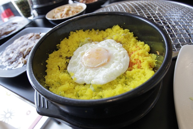 เมนูข้าวยำ (Bibimbub) ที่นี่ก็น่าสนใจ ไม่ใช่ข้าวยำแบบฟาสต์ฟูดที่รสออกเผ็ดจัดจ้าน แต่ข้าวยำแบบเกาหลีนี่ไม่มีรสเผ็ด โปะไข่ดาวปกคลุมเครื่องเคราไว้ในชาม เวลาจะกินก็ต้องคลุก ๆ เหมือนเดิม อร่อย สามารถกินแกล้มกับกิมจิได้ รู้สึกจะเป็นเมนูยอดนิยมของที่นี่ด้วย