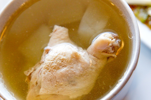 ถ้าจะสั่งซุปมากินให้คล่องคอซะหน่อยละก็ อย่าพลาด เป็ดตุ๋นมะนาวดอง ร้าน แสนยอด นะคะ เค้าเสริฟมาในโถตุ๋นโบราณแบบดั้งเดิม แถมกรรมวิธีการปรุง ก็ยังเป็นแบบดั้งเดิมด้วย คือตุ๋นทีละโถในซึ้งตามตำรับโบราณกว่าสามชั่วโมง ไม่ได้เอาเร็วต้มเป็นหม้อ แล้วมาตักใส่โถตอนเสริฟ เป็ดจึงเปื่อยนุ่ม น้ำแกงรสดีมากๆ คือไม่เปรี้ยวมะนาวดองจนเกินไป หรือเปรี้ยวจนกลายเป็นขม แต่รสชาติกลมกล่อม หวานน้ำจากเป็ด เปรี้ยวบิดๆ จากมะนาวดอง ซดอร่อยจนหมดโถแบบไม่รู้ตัวเลยค่ะ