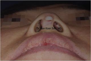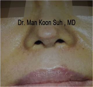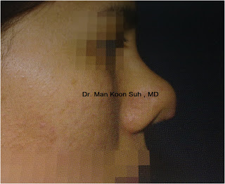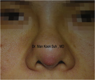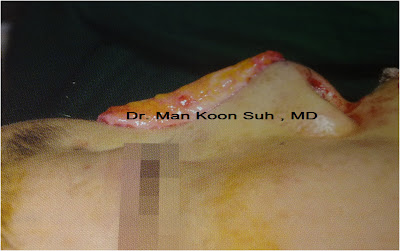 2.2 ) ถอด Silicone ออก เย็บแผลบริเวณปลายจมูก แล้ว เสริมใหม่ด้วย dermal fat graft ทั้งหมดตั้งแต่ สันจมูก จนถึงปลายจมูก เหตุผลที่ต้องใช้เนื่อเยื่อตัวเองทั้งหมดเป็น เพราะว่า เมื่อจมูกอักเสบ หรือ ทะลุแล้ว แสดงว่ามีเชื้อโรคเข้าไปแล้ว ในบริเวณที่จะเสริม ดังนั้นถ้าเสริมจมูกโดย Silicone หรือ Gortex ก็อาจเกิดการติดเชื้อได้ง่าย แต่อย่างที่บอกนะครับ dermal fat graft เสริมแล้วมักไม่โด่ง แพทย์เกาหลี จึงให้ รอซัก 3 -4 เดือนเพื่อทำการแก้ไขใหม่โดยการเสริม silicone