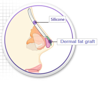 ดังนั้นเพื่อป้องกันการบุ๋มของปลายจมูก แพทย์จะต้องนำ เอาเนื้อเยื่อของคนไข้เองไปลองรับผิวบริเวณนั้นไม่ให้บุ๋มลงไป โดยเนื้อเยื่อที่ว่า จะเรียกว่า Dermal fat Graft : ซึ่งตำแหน่งของ Dermal fat Graft ที่หมอเกาหลี นิยมใช้นั้นไม่ใช่ เนื้่อเยื่อหลังหู แบบหมอไทยนะครับ