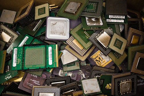 ภายในคอมพิวเตอร์ที่ทิ้งแล้ว แผงวงจรต่างๆประกอบด้วยเงินและทองแดง ส่วนทองคำคือส่วนประกอบที่สำคัญของไมโครโปรเซสเซอร์หรือซีพียูนั่นเอง