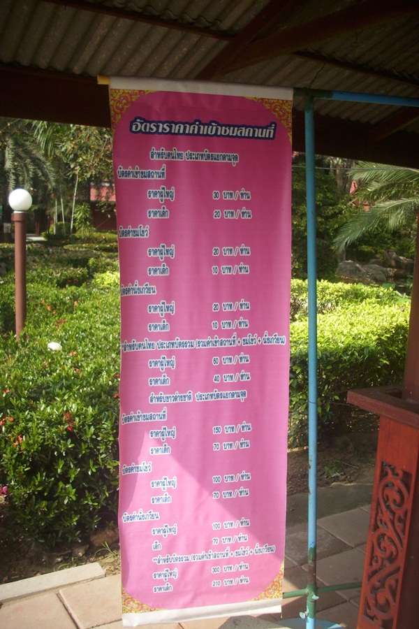 จุดเเรกที่เมื่อเดินเข้ามาถึงก็ต้องซื้อตั๋วเพื่อเข้าไปด้านในกันนะครับ สำหรับคนไทย่าเข้าชม ผู้ใหญ่ 30 บาท เด็ก 20 บาท ค่าชมการเเสดง ผู้ใหญ่ 20 บาท เด็ก 10 บาท ค่านั่งเกวียน ผู้ใหญ่ 20 บาท เด็ก 10 บาท ส่วนราคาเหมารวมสามอย่าง ผู้ใหญ่ 60 บาท เด็ก 40 บาทครับ