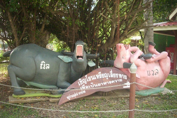 เมื่อเข้าไปถึง จุดเเรกที่จะพบคือ เจ้านิลกับเจ้านวล ให้ได้โยนเหรียญเสี่ยงทายให้เข้าปากเพื่อเป็นอาหารให้น้องควายภายในบ้านอนุรักษ์ควายไทยครับ
