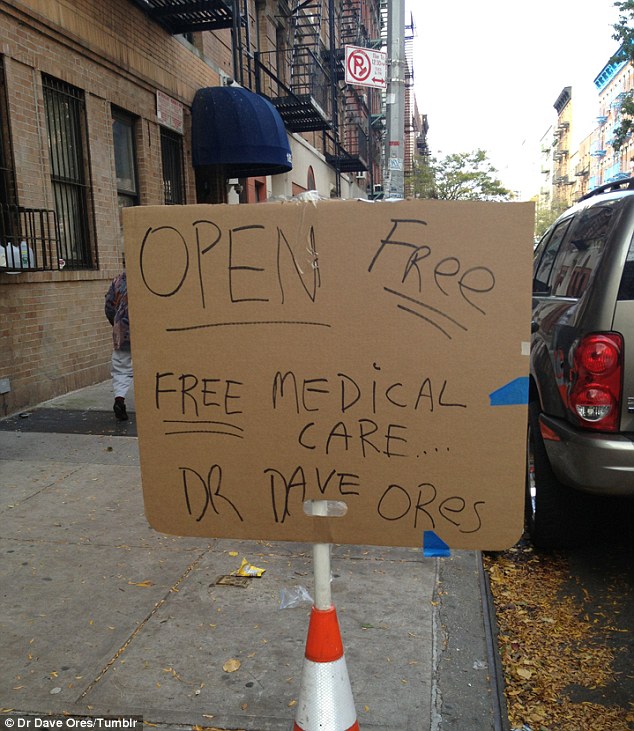 ดร.เดฟ เขียนข้อความให้ประชาชนทราบว่าที่นี่รักษาและมียาฟรี