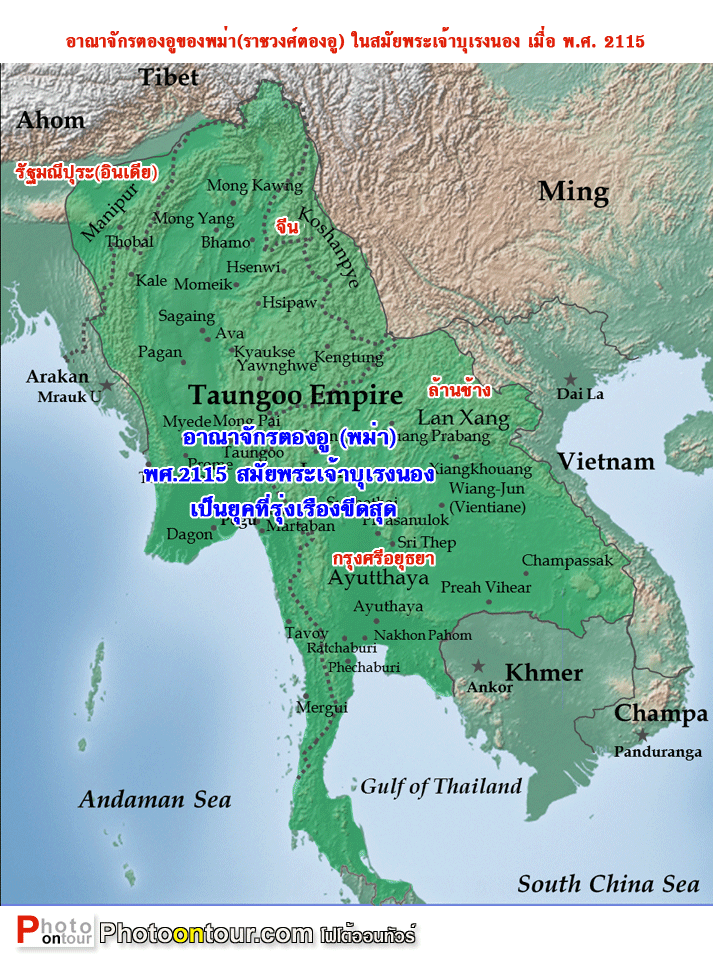 พระเจ้าบุเรงนอง นับว่าเป็นกษัตริย์พม่าที่ทางพม่านับว่า เป็นกษัตริย์ที่ยิ่งใหญ่ 1 ใน 3 พระองค์ ด้วยความเป็นกษัตริย์นักรบอันเป็นที่ปรากฏพระเกียรติเลื่องลือ โดยยุคสมัยของพระองค์ อาณาจักรตองอูเข้มแข็งและแผ่ไพศาลอย่างที่สุดในประวัติศาสตร์ โดยครอบคลุมอาณาเขตตั้งแต่ลุ่มน้ำอิระวดีจนถึงลุ่มแม่น้ำโขง มีประเทศราชต่าง ๆ มากมายในภูมิภาคอุษาคเนย์ ได้แก่ หงสาวดี, ล้านช้าง, ไทยใหญ่, เขมร, ญวน, อยุธยา, เชียงใหม่ เป็นต้น