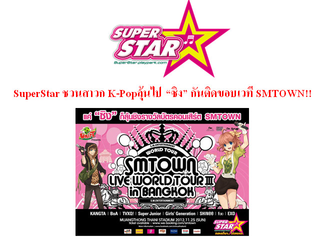 ขอเสียง “ซิง” ของสาวก K-Pop หน่อย เร๊วววว......งานนี้จะไม่ให้กรี๊ดได้ยังไง ก็ SuperStar คาราโอเกะออนไลน์ ครั้งแรกของเมืองไทย จาก PlayParkจะพาสาวก K-Popไป “ซิง” กันให้มันส์นอกสถานที่ติดขอบเวที กับคอนเสิร์ต "SMTOWN LIVE WORLD TOUR III in BANGKOK" คอนเสิร์ตครั้งยิ่งใหญ่ส่งท้ายปี ที่เหล่าศิลปิน SM Entertainment มากันยกค่าย! ไม่ว่าจะเป็นรุ่นใหญ่อย่าง KANGTA (คังตะ), BoA (โบอา), TVXQ! (ทงบังชินกิ), Super Junior (ซูเปอร์จูเนียร์) เด็กแสงทรงพลังอย่าง SHINee (ชายนี่) สาวๆจาก Girls' Generation (เกิร์ลส์ เจเนอเรชั่น) และ f(x) (เอฟเอ็กซ์) รวมถึงน้องใหม่มาแรงEXO (เอ็กซ์โซ) จัดมากันเต็มที่ขนาดนี้ ไม่ต้องบอกก็รู้ว่าการแสดงจะมันส์เต็มรูปแบบขนาดไหน ทั้งร้อง-เล่น-เต้น-โชว์ และแสงสีเสียงสุดอลังการที่หาชมได้ยากมว๊าก แหม...บอกมาแค่นี้ก็อยากไปกันแล้วใช่มั้ยล่ะ!! มาร่วมลุ้นเป็นผู้โชคดีที่จะได้ไปมันส์ติดขอบเวทีกันได้ง่ายๆ เพียงแค่มาซิงกับ SuperStar โหมดคาราโอเกะ เพลงใดก็ได้ให้ครบ 10 เพลง ตั้งแต่ วันนี้ - 21 พฤศจิกายน โดยทีมงานจะทำการสุ่มหาผู้โชคดีที่ได้รับบัตรคอนเสิร์ตซึ่งมีเพียง 1 รางวัลเท่านั้น (รางวัลละ 2 ใบ) รอบการแสดงวันที่ 25 พฤศจิกายน นี้ อ๊ะๆ ช้าไม่ได้แล้ว ขอตัวไป “ซิง” ก่อนล่ะนะค๊า