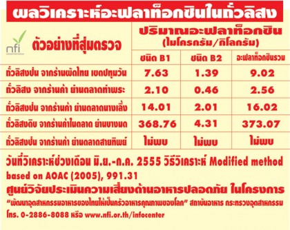 ผลวิเคราะห์พบว่ามีถั่วลิสง 4 ใน 5 ตัวอย่าง พบสารอะฟลาท็อกซินปนเปื้อน และพบ 1 ตัวอย่างที่มีการปนเปื้อนเกินค่ามาตรฐานของไทยคือ เกิน 20 ไมโครกรัม ต่ออาหาร 1 กิโลกรัม