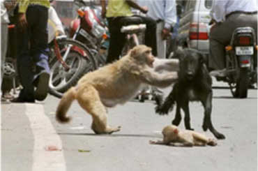 ลิงต่อสู้กับสุนัขเพื่อปกป้องลูก