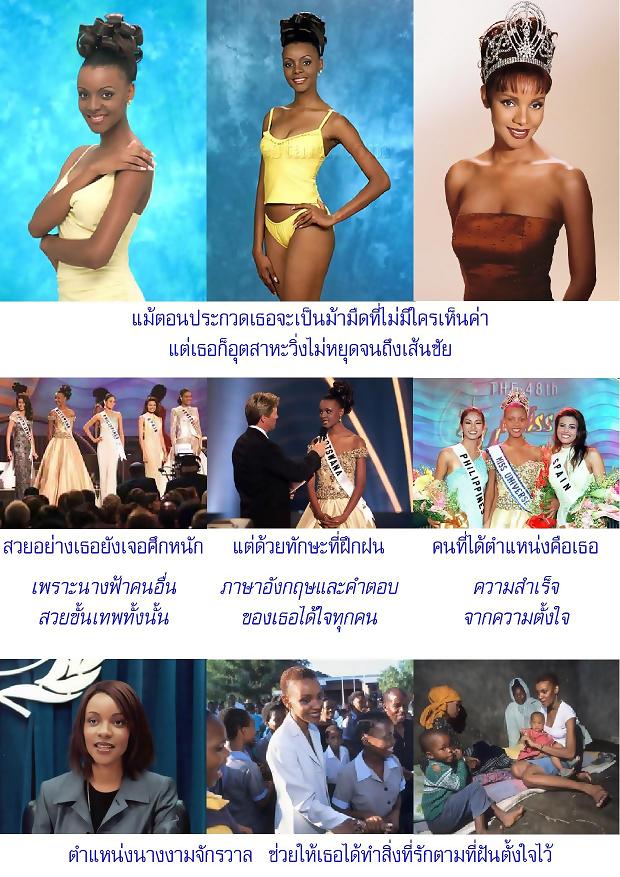 เวนดี้เป็นนางงามผิวสีมีดีที่รูปร่างและ “น้ำใจ” ถึงหน้าตาเธอจะน่ารัก แต่เมื่อเทียบกับประเทศมหาอำนาจขาอ่อน เธอกลับดูด้อยไปอย่างไม่เป็นธรรม แต่เวนดี้ก็เข้าใจจุดนี้ดี ด้วยรูปร่างที่สมบูรณ์แบบ ทำให้เธอผ่านรอบชุดว่ายน้ำได้ฉลุย และเธอเน้นจุดนี้ต่อเนื่องในรอบชุดราตรี ด้วยการเลือกชุดที่ไม่โป๊เปลือย แต่อวดถึงความได้สัดส่วนโค้งเว้าที่สวยงามของรูปร่าง เพื่อให้ตัวเองเข้ารอบต่อไปให้ได้ แล้วก็สำเร็จ ในการสัมภาษณ์ ทุกคำพูดแสดงออกถึงความห่วงใยเพื่อนมนุษย์อย่างใจจริง ทำให้เธอได้ตำแหน่งนี้ไปครองท่ามกลางความยินดีอย่างเหลือล้นของเพื่อนผู้เข้าร่วมประกวด ที่กรูเข้ามาแสดงความยินดีกับเวนดี้ การ์ดบนเวทีและนางงามจักรวาลปีก่อนหน้า ต้องฝ่าด่านเพื่อสวมมงกุฎให้เธอด้วยความยากลำบาก แต่นั่นก็เป็นการยืนยันว่า เวนดี้ไม่ได้เสแสร้งพูด เธอเป็นอย่างที่พูดจริงๆ ซึ่งความดีใจของเพื่อนนางงามเป็นข้อพิสูจน์ได้อย่างดี