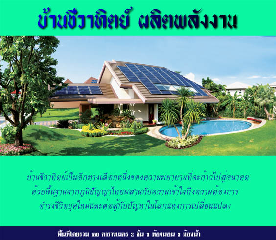 บ้านพลังงานแสงอาทิตย์ ที่ว่า หรือ บ้านชีวาทิตย์ ถูกสร้างขึ้นโดยอาศัยหลักการด้านการประหยัด พลังงาน และการใช้ปัจจัยพื้นฐาน ธรรมชาติให้มากที่สุด การออกแบบที่ จะให้เกิดการประหยัดพลังงาน เริ่มต้น จากการเลือกใช้ผนัง EIPS ที่จะช่วย ลดความร้อน การออกแบบและเลือกใช้ หลังคาบ้านที่ทำจากแอสฟันซ์ ทำให้ ความร้อนที่ส่งผ่านหลังคาน้อยมาก การใช้กระจกฮีทสต๊อปสำหรับกระจก ประตูหน้าต่างซึ่งป้องกันรังสียูวี และ รังสีอินฟราเรด การใช้สีผสมเม็ดทราย ทาภายนอกบ้าน เพื่อป้องกันรังสียูวี เป็นต้น ในส่วนของสภาพแวดล้อม โดยรอบ มีการปลูกต้นไม้ทั้งไม้ใหญ่ ไม้พุ่ม และต้นหญ้า ซึ่งล้วนเป็นปัจจัย สำคัญที่ช่วยให้ประหยัดพลังงานระบบปรับอากาศเป็นแบบรวมศูนย์เพื่อ ควบคุมอุณหภูมิทั่วบ้าน ซึ่งประหยัด กว่าการติดตั้งเครื่องปรับอากาศเพียง ห้องเดียว รวมถึงการวางทิศทางของ ตัวบ้านให้สามารถรับกระแสลมเย็นได้ อย่างเต็มที่ พลังงานไฟฟ้าที่ใช้ ผลิตจาก แผงโซลาเซลล์ขนาด 128 ตารางเมตร มีระบบสำรองกระแสไฟ 3 วัน ปริมาณ ไฟฟ้าที่ได้ เพียงพอสำหรับ 4-5 คน ภายใต้การใช้ไฟฟ้าปกติ ซึ่งรวมถึง เครื่องปรับอากาศ และเครื่องทำน้ำอุ่น หากเปรียบเทียบกับบ้านทั่วไป ต้องใช้ แผงโซลาเซลล์ถึง 7 แผง จึงผลิตไฟฟ้า ได้เพียงพอความต้องการ ส่วนน้ำที่ ใช้สอยสะสมจากน้ำค้างจากหลังคาและ น้ำจากเครื่องปรับอากาศ นอกจากนี้ ความร้อนที่เกิดจากการทำงานของ ระบบปรับอากาศถูกนำไปผลิตน้ำอุ่น พร้อมทั้งระบายความร้อนด้วยน้ำลง สระว่ายน้ำ สำหรับห้องครัวมีการใช้ พลังงานจากก๊าซชีวภาพ โดยมีแหล่ง พลังงานจากเศษอาหาร และห้องน้ำ บ้านชีวาทิตย์มีพื้นที่ใช้สอยประมาณ 180 ตารางเมตร ประกอบด้วย 3 ห้องนอน 3 ห้องน้ำ มีห้องรับแขก ห้องสัมผัสธรรมชาติ ห้องครัว และ ส่วนรับประทานอาหาร