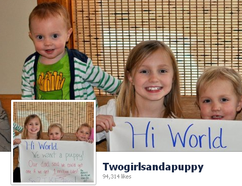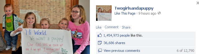 ฟังดูเป็นเงื่อนไขที่เป็นไปไม่ได้เอาซะเลย แต่ไม่น่าเชื่อว่าหลังจาก 6 ชั่วโมงกว่าๆ ที่เด็กเหล่านี้ทำ Facebook Page Twogirlsandapuppyและโพสต์รูปพวกเธอถือป้ายใจความว่า “สวัสดีค่ะ พวกหนูอยากได้น้องหมา ป๊ะป๋าบอกว่าถ้าหนูได้ล้านไลค์ หนูจะได้น้องหมามาครอง ป๊ะป๋าเสนอเงื่อนไขพวกนี้เพราะคิดว่าหนูทำไม่ได้หรอก! แต่หนูจะทำให้ได้ (อันนี้แอบเติมเอาเอง) เพราะงั้นช่วยไลค์ให้พวกหนูด้วยนะค้าาา” แล้วพวกเธอก็ได้ล้านไลค์มาครองสำเร็จ