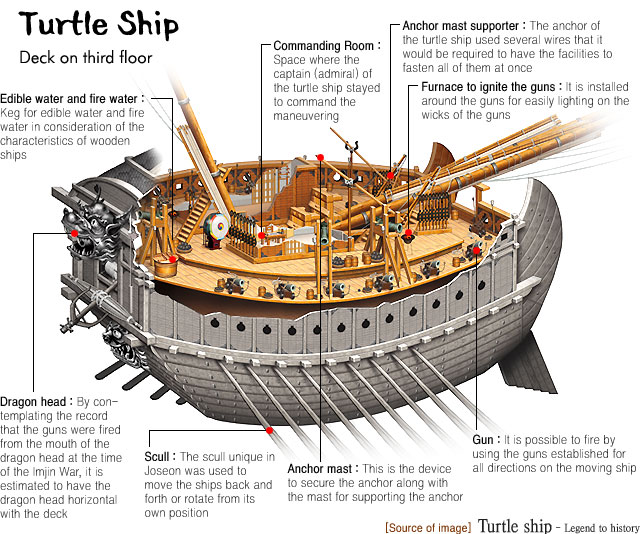 สำหรับเรือเต่านี้ มีรูปร่างแบนค่อนข้างเทอะทะ ขับเคลื่อนด้วยกำลังฝีพาย ทุกด้านของลำเรือปิดไว้อย่างมิดชิด โผล่ก็แต่ปลายกระบอกปืนใหญ่เท่านั้น ขณะที่ดาดฟ้านั้นถูกคลุมด้วยแผ่นเหล็กและยังเต็มไปด้วยหนามแหลม เพื่อป้องกันมิให้ข้าศึกส่งทหารขึ้นมาบนเรือ