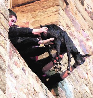 สัตว์ที่ว่านี้คือ แพะ ซึ่งถูกโยนลง มาจากหอระฆังสูง 50 ฟุต ลงมายังพื้นด้านล่างที่มีกลุ่มคนถือผ้าผืนใหญ่รอรับตัวมันอยู่ จึงไม่น่าแปลกใจเลยที่นักต่อ