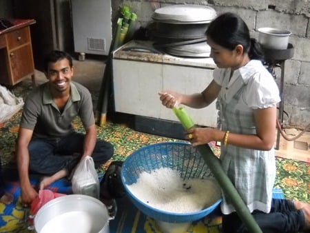 เมื่อของทุกอย่างครบองค์ ให้นำข้าวเหนียวที่แช่ได้ที่แล้ว กรอกลงกระบอก