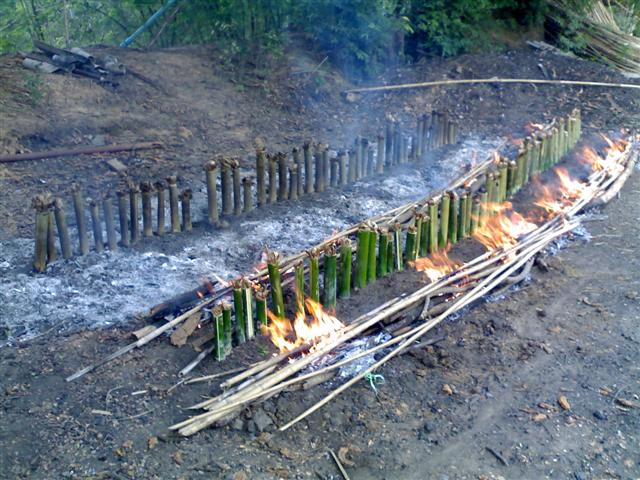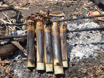 อันดับแรกก็เริ่มต้นที่ป่าไผ่ครับ ไม้ไผ่ที่เอามาทำต้องไม่อ่อนและแก่เกินไป (แล้วตรูจะรู้ไงไหนอ่อนไหนแก่) ไม้ไผ่ที่นิยมมาทำก็ได้แก่ ไม้ไผ่สีสุก กรณีทำข้าวหลามกระบอกใหญ่ แต่ถ้ากระเล็กนี้ไม้ไผ่อะไร ไม่รู้จักจะเรียก แต่ไม่ใช่ไผ่ พาทิศ อันนั้น ลำเล็กไป