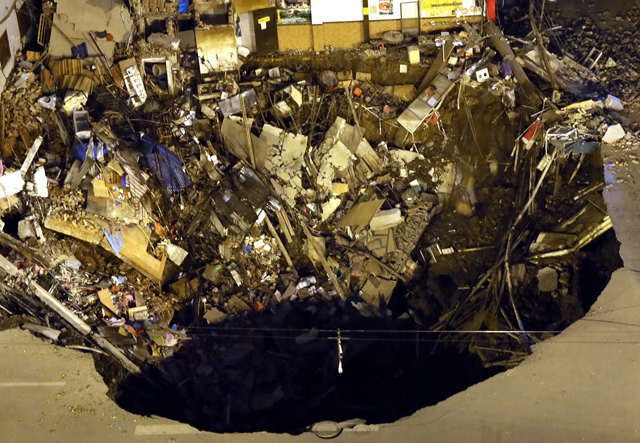 หลุมยุบดังกล่าวลึกกว่า 9 เมตร กว้างกว่า 30 เมตร เป็นเหตุให้ตึกซึ่งเป็นร้านขายของชำ 2 ร้านแรกพังถล่มลงมา แต่โชคดีที่ไม่มีผู้ใดได้รับบาดเจ็บ เพราะก่อนหน้านี้ราว 20 นาที คนงานก่อสร้างของเมืองสังเกตเห็นการยุบตัวของเขตก่อสร้าง จึงประกาศอพยพชาวบ้านออกจากพื้นที่ ต่อมาในเวลา 18.30 น. ร้านของชำที่สูงราว 6 ชั้นก็ถล่มตามลงมาเป็นตึกที่ 3