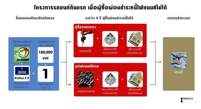 นายสมชายกล่าวว่า ช่วงที่มายื่นเอกสารขอใช้สิทธิ์รถคันแรก “ผู้ใช้สิทธิ์ต้องทำหนังสือยินยอม” สัญญาสละสิทธิการโอนรถยนต์คันแรกภายใน 5 ปี หากผู้ใช้สิทธิ์ทำผิดเงื่อนไข เช่น ขายรถยนต์ก่อนครบกำหนด 5 ปี หรือ ถูกไฟแนนซ์ยึดรถก่อน 5 ปี ผู้ใช้สิทธิ์หรือไฟแนนซ์ต้องนำเงินภาษีมาคืนกรมสรรพสามิตพร้อมกับดอกเบี้ยก่อน จากนั้นกรมสรรพสามิตจะแจ้งให้กรมการขนส่งทางบกยกเลิกคำสั่ง “ปลดล็อคห้ามโอนภายใน 5 ปี” เพื่อให้ผู้ใช้สิทธิ์ หรือไฟแนนซ์สามารถโอน หรือขายรถยนต์ให้ผู้อื่นต่อไปได้