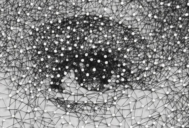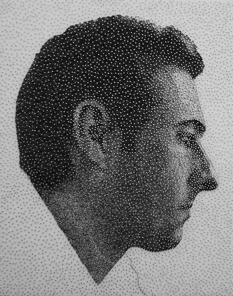 จ้องดีๆ ภาพวาด จากเส้นด้ายเพียงเส้นเดียว ศิลปินชาวญี่ปุ่นที่ทำงานอยู่ในนิวยอร์ค ได้รังสรรค์ภาพสุดพิเศษด้วยการพันได้รอบตะปูนับร้อยพันที่ตอกบนกระดาน ด้วยด้ายสีดำเพียง 1 เส้นเท่านั้น ย้ำ!! ว่าเพียงแค่เส้นเดียว จนเกิดภาพใบหน้าคนขึ้นมา ราวกับใช้ดินสอ EE สเก๊ตซะอย่างนั้น หากลองมองจ้องที่ภาพใกล้ๆ จะเห็นได้ว่า ส่วนประกอบต่างๆของภาพแม้แต่รายละเอียดเล็กๆน้อยๆนั้นล้วนใช้ด้ายพันทั้งสิ้น รวมถึงเส้นผม คิ้ว และ ตาดำ