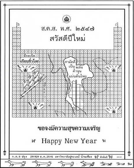 ปี พ.ศ. 2547 จะเห็นได้ว่า เป็นรูปแผนที่ประเทศไทย รวมรอบไปด้วยประเทศเพื่อนบ้าน พม่า เขมร ลาว เวียดลาม มาเลเซีย แสดงว่าคือ อาเซียน มีลูกระเบิดอยู่จำนวน 4 ลูก รอมแผ่นดินอยู่ และระเบิดทุกลูกนั้นจุดฉนวนไว้พร้อมจะระเบิด ซึ่งก็แปลว่า วิกฤติทุกอย่างเริ่มมาบรรจบแล้ว ที่มุมซ้ายมือของ สคส. จะมีข้อความเขียนไว้ว่า มีระเบิดอยู่เกือบทั่วโลก และยังมีเรือใบที่กินลมอยู่มุ่งหน้าเข้าสู่อาเซียน แสดงว่า ระเบิดทั่วโลกกำลังมุ่งมาสู่อาเซียน พระองค์ท่านเตือนประเทศไทย หรือประชาชนคนไทยตั้งปี พ.ศ. 2547 แต่คนไทยมั่วทำอะไรอยู่ งั้นเรามาเริ่มที่ละอย่างกันเลยว่าแต่ละสิ่งที่ปรากฏในรูปนั้นมีนัยอะไรบ้าง ดิฉันขอเริ่มที่รูปเรือ ถ้าจะให้ความหมายว่าเรือหมายถึงอะไรบอกได้เลยว่า เรือ คือการ “ล่า” การล่าอนานิคมแบบใหม่ คือ 1. ล่าแผ่นดิน 2. ล่า