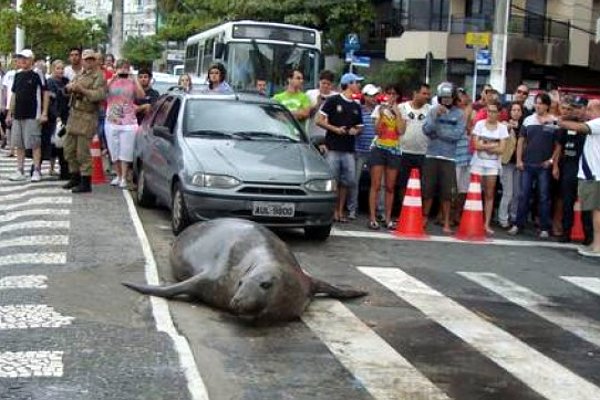 คลิปแมวน้ำตัวหนึ่งไม่ทราบว่ามันมาจากไหนกำลังข้ามทางม้าลายท่ามกลางถนนที่มีรถพลุกพล่านบนถนนในประเทศบราซิล