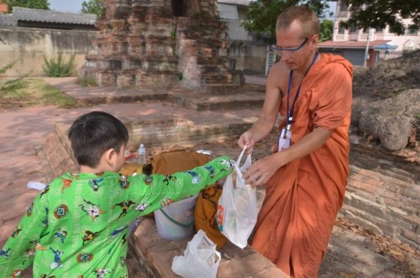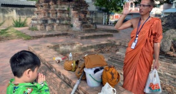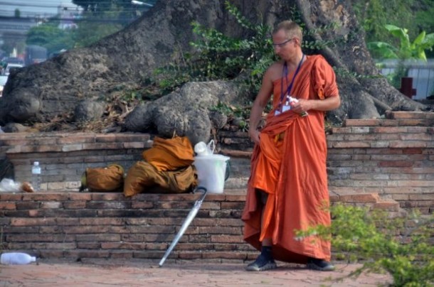 พระวิริยะ พุทธวิริยา อายุ 46 ปี ชาวอเมริกัน ธุดงที่ จ.พระนครศรีอยุธยา วันที่ 21 มี.ค. ผู้สื่อข่าวได้พบกับพระสงฆ์ชาวต่างชาติรูปหนึ่ง กำลังนั่งใช้เข็มเย็บจีวรที่ชำรุดเสียหาย บริเวณวัดร้างใกล้กับถนนป่ามะพร้าว หลัง บก.ภ.จว.พระนครศรีอยุธยา ต.หอรัตนไชย มีสัมภาระวางอยู่หลายชิ้น จึงเข้าไปสอบถาม ทราบชื่อ พระวิริยะ พุทธวิริยา อายุ 46 ปี ชาวอเมริกัน