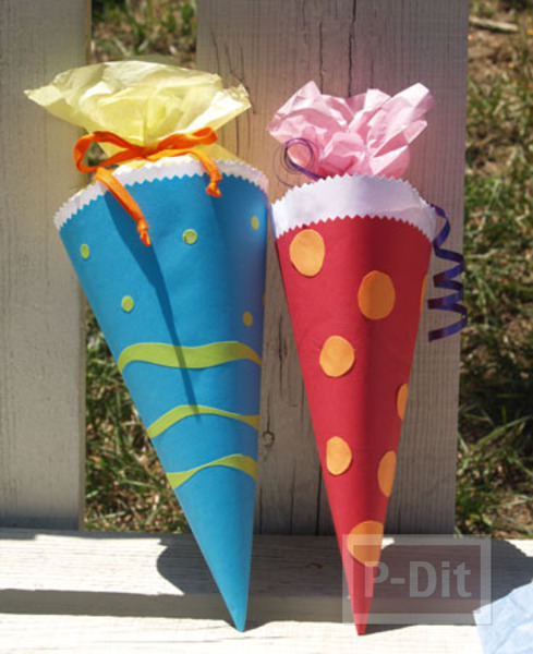 - ม้วนกระดาษเป็นรูปกรวย ติดกาวด้านข้างให้เรียบร้อย