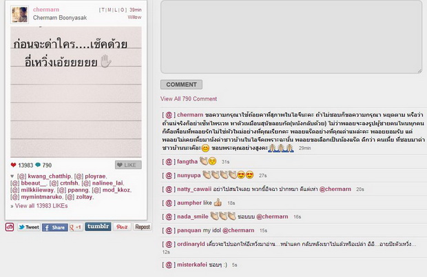 "ขอความกรุณาใช้ถ้อยคาที่สุภาพในไอจีนะคะ ถ้าไม่ชอบก็ขอความกรุณา หยุดตาม หรือว่าถ้าแน่จริงก็อย่าเซ็ทไพรเวท ทำตัวเหมือนสุนัขลอบกัด (หนังกลับด้วย) ไม่ว่าพลอยจะลงรูปผู้ชายคนไหนทุกคนก็คือเพื่อนที่พลอยรักไม่ใช่ผัวใหม่อย่างที่คุณเรียกคะ พลอยแ-ด อย่างที่คุณด่าแหล่ะคะ พลอยยอมรับ แต่พลอยไม่เคยเ...้- มานั่งด่าชาวบ้านในไอจีเพราะฉะนั้น พลอยขอเลือกเป็นน้องแ-ด ดีกว่า คนเ...้- ที่ชอบมาด่าชาวบ้านนะเค๊อะ ขอบพระคุณอย่างสูงคะ"
