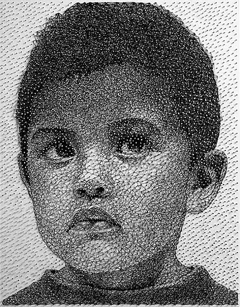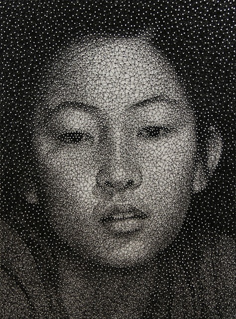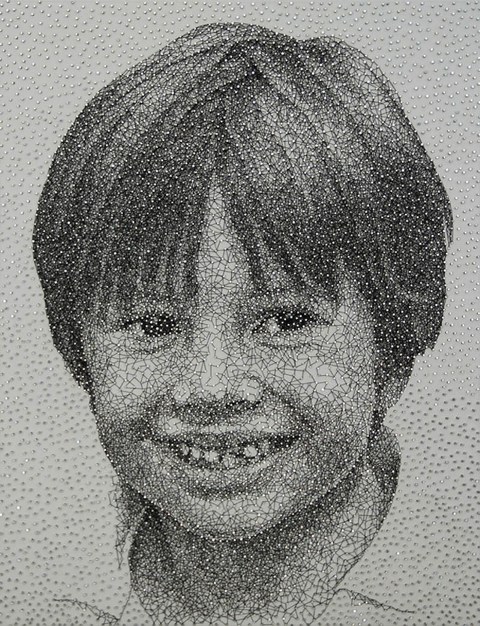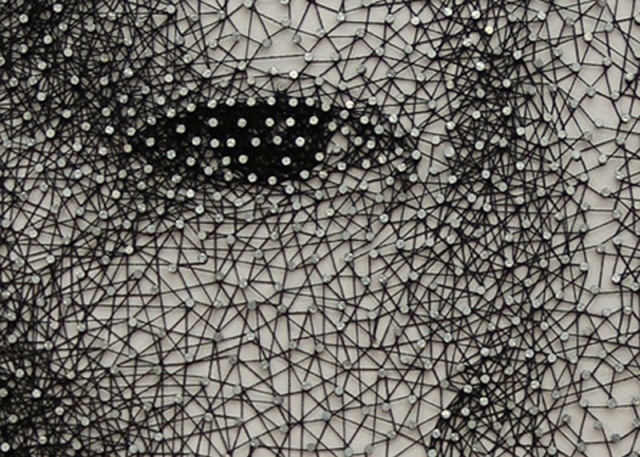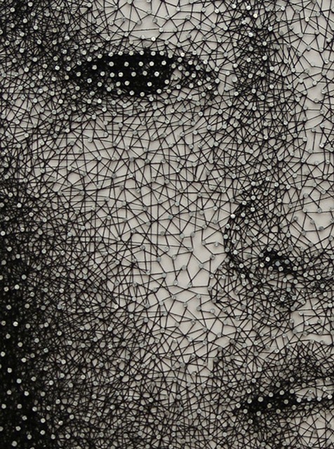 จ้องดีๆ ภาพวาด จากเส้นด้ายเพียงเส้นเดียว ศิลปินชาวญี่ปุ่นที่ทำงานอยู่ในนิวยอร์ค ได้รังสรรค์ภาพสุดพิเศษด้วยการพันได้รอบตะปูนับร้อยพันที่ตอกบนกระดาน ด้วยด้ายสีดำเพียง 1 เส้นเท่านั้น ย้ำ!! ว่าเพียงแค่เส้นเดียว จนเกิดภาพใบหน้าคนขึ้นมา ราวกับใช้ดินสอ EE สเก๊ตซะอย่างนั้น หากลองมองจ้องที่ภาพใกล้ๆ จะเห็นได้ว่า ส่วนประกอบต่างๆของภาพแม้แต่รายละเอียดเล็กๆน้อยๆนั้นล้วนใช้ด้ายพันทั้งสิ้น รวมถึงเส้นผม คิ้ว และ ตาดำ