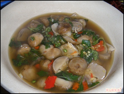 -เอาน้ำใส่หม้อสักหนึ่งถ้วย แล้วเอาพริกแกงที่โขลกเตรียมไว้ลงไปในหม้อคนให้เข้ากัน พอเดือดอีกที่เอาเห็ดลง