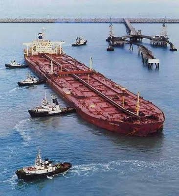 ภาพขณะกำลังเข้าจอดที่ท่อส่งน้ำมัน โดยมีเรือลากจูงดันเข้าสู่แนวท่อส่งน้ำมัน
